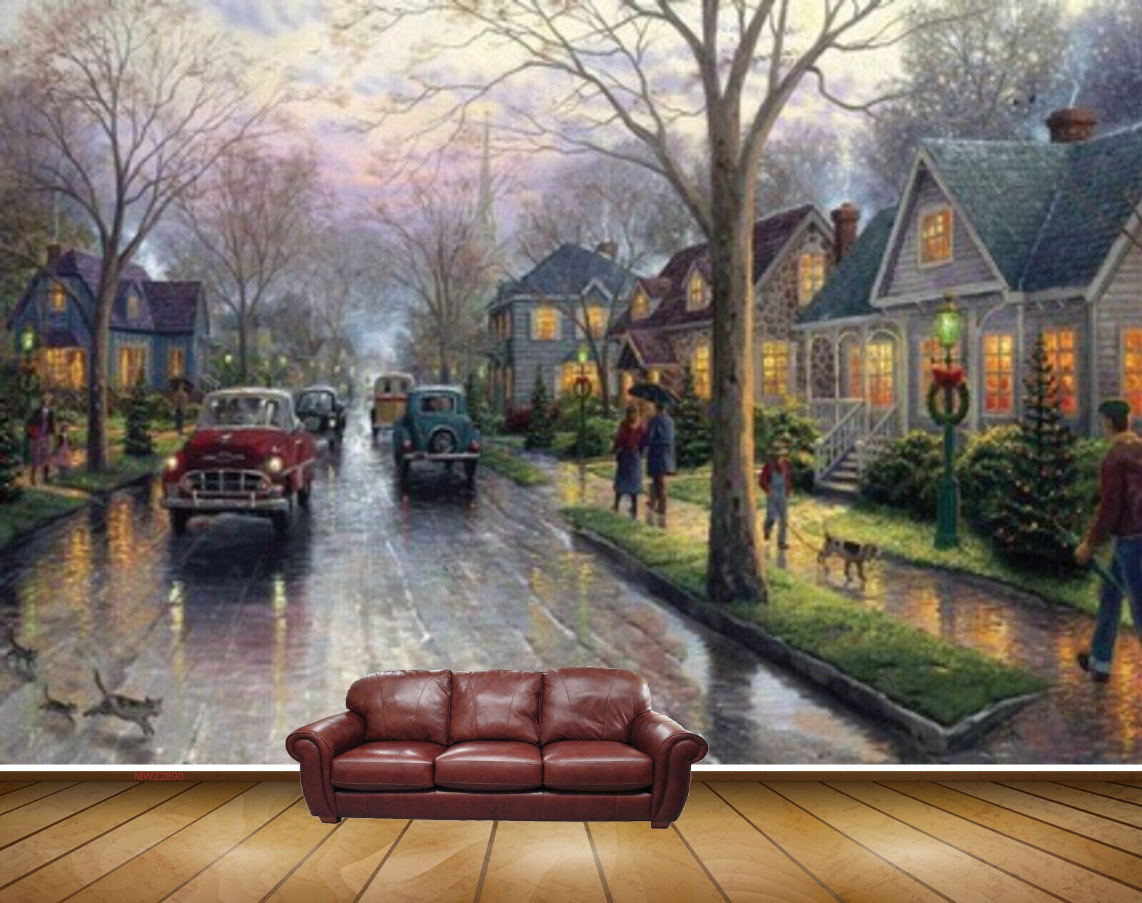 Avikalp MWZ2890 Houses Trees Road Cars People Dog Cat Grass Plants Painting HD Wallpaper